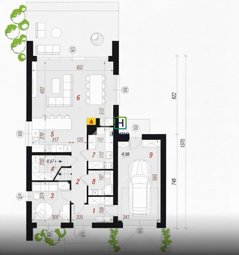 Parter: salon z kominkiem + jadalnia, kuchnia, spiżarnia, łazienka, pokój, wiatrołap, kotłownia, garaż.